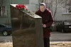 Maria Kiselyeva (86) discreetly put down her three red carnations, to commemorate the war cruelties. She stands completely still for a few minutes, then says a quiet prayer.