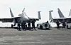 Another F-18 moves towards the runway and is immediately in the air with the others.